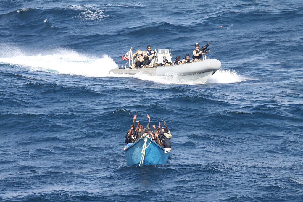 | A visit, board, search and seizure team from the guided-missile destroyer USS Pinckney (DDG 91) approaches a suspected pirate vessel after the Motor Vessel Nordic Apollo reported being under attack and fired upon by Somali pirates in the Gulf of Aden in December 2011 (U.S. Navy photo) Photo License: CC-BY 3.0 |